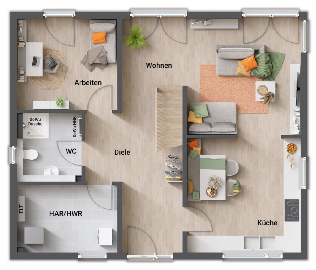 - gerade Treppe (zentral im Erdgeschoss, „teilt“ Koch- und Wohnbereich)